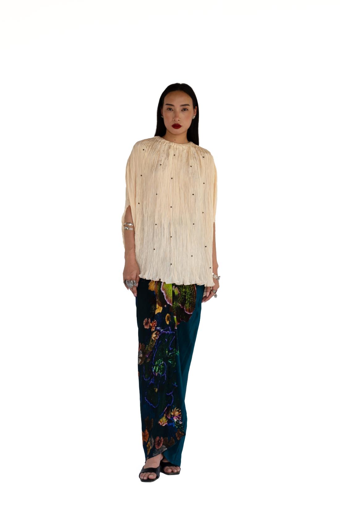 Suha is creatively pleated blouse top that is paired up with romantic blue skirt, A MUST HAVE if your style is understated !